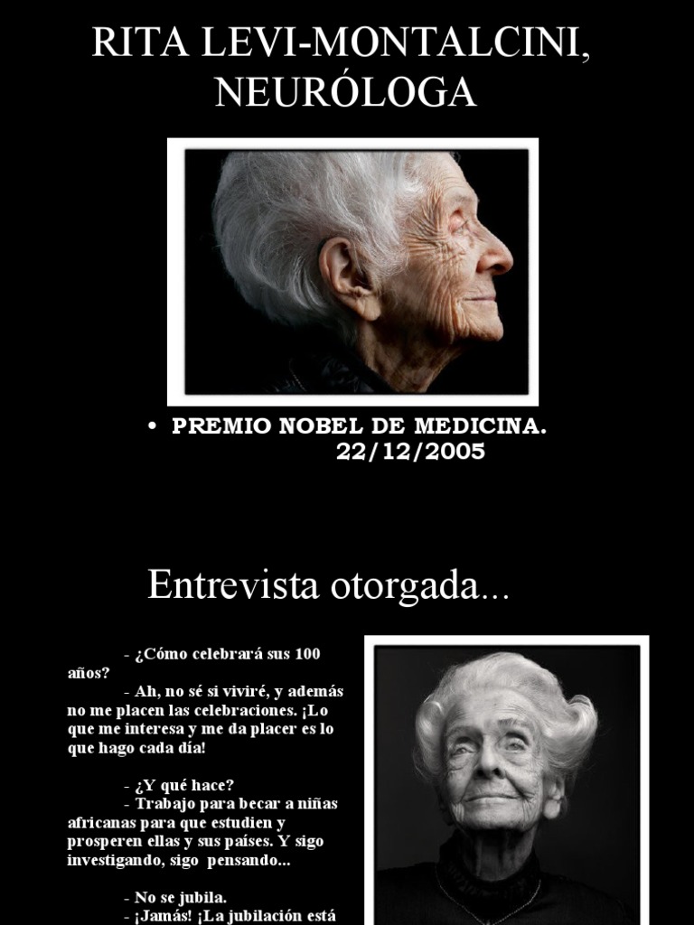 She talks about why she had to make a laboratory in her rita levi montalcini premio nobel. Nel 1986 vinse il nobel per la medicina grazie alla scoperta e all'identificazione del fattore di accrescimento della fibra nervosa.